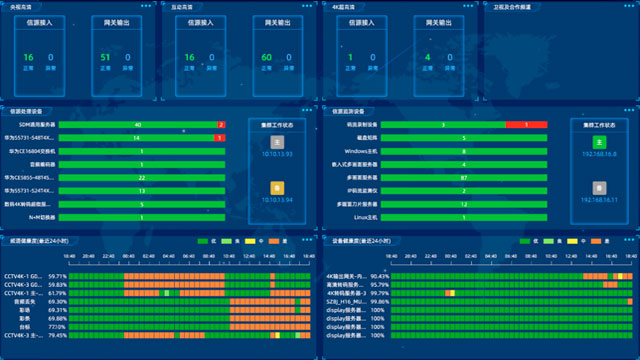 利用數字孿生技術對新媒體播控平臺的業務流程、視音頻內容等播出要素,系統設備、機房機架等生產要素,溫濕度、煙感、水浸、電力、安防等環境因素進行綜合采集監測呈現,提供最直觀的管理窗口。